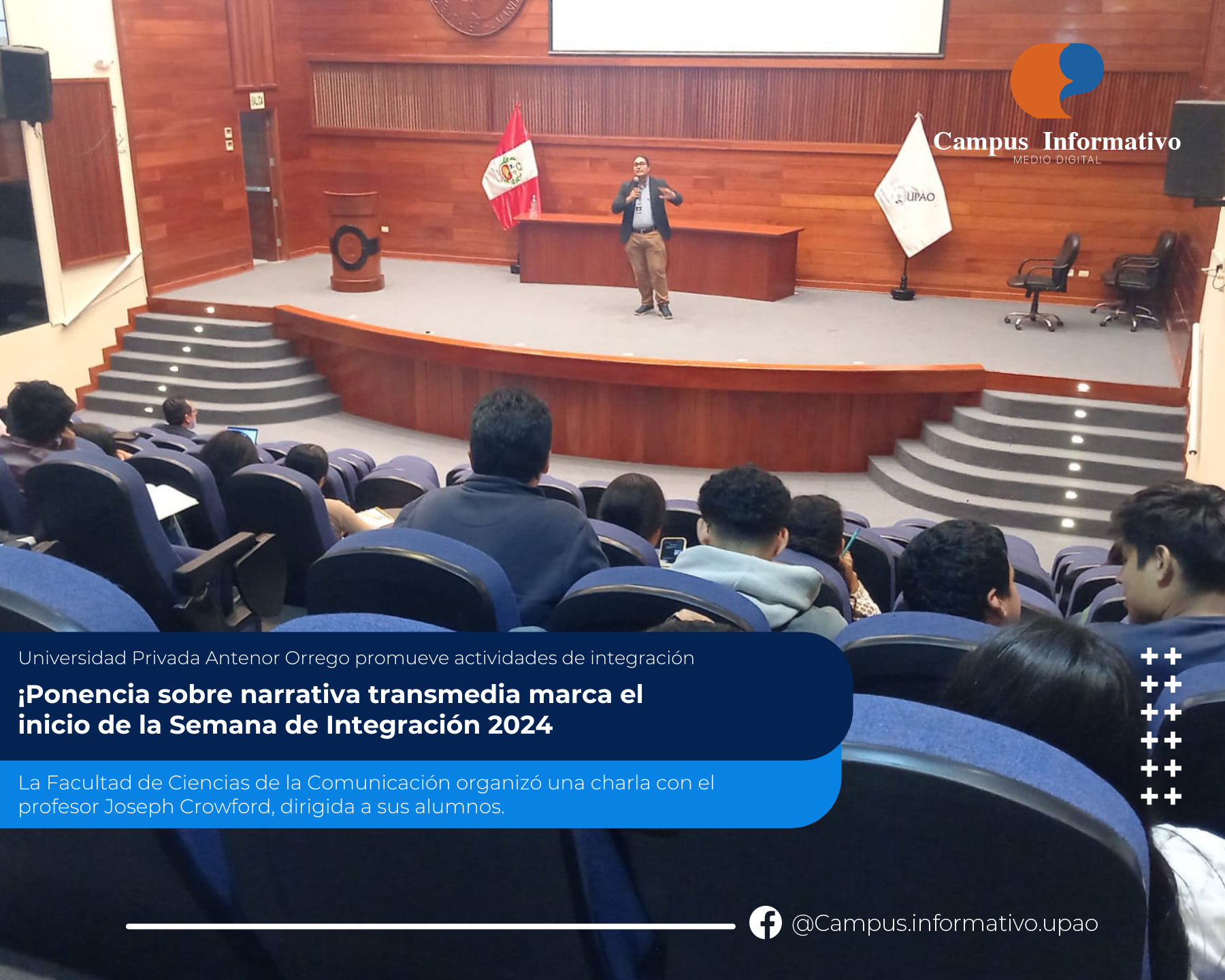 Piura, 7 de noviembre de 2024 – Como parte de la Semana de Integración de la Facultad de Ciencias de la Comunicación, la Universidad Privada Antenor Orrego (UPAO) organizó una ponencia especial a las 8:30 a.m., en la que participó el reconocido profesor e investigador Joseph Crowford. Durante el evento, Crowford presentó su investigación sobre...